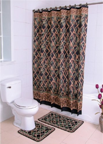 NEW "AMAZON" FABRIC SHOWER CURTAIN, FABRIC COVERED RINGS, AREA RUG & CONTOUR RUG SET - BLACK